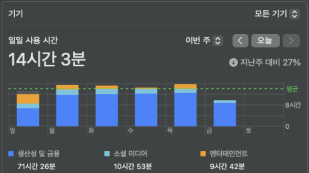 월-금, 일일 평균 노트북 사용시간 12시간