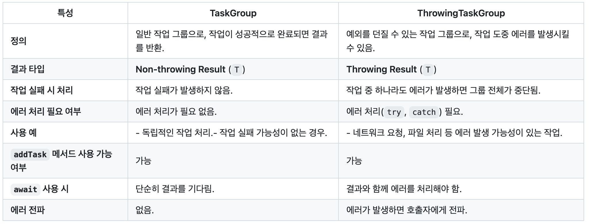 TaskGroup에는 Throwing할 수 있는 ThrowingTaskGroup이 별도로 있다.