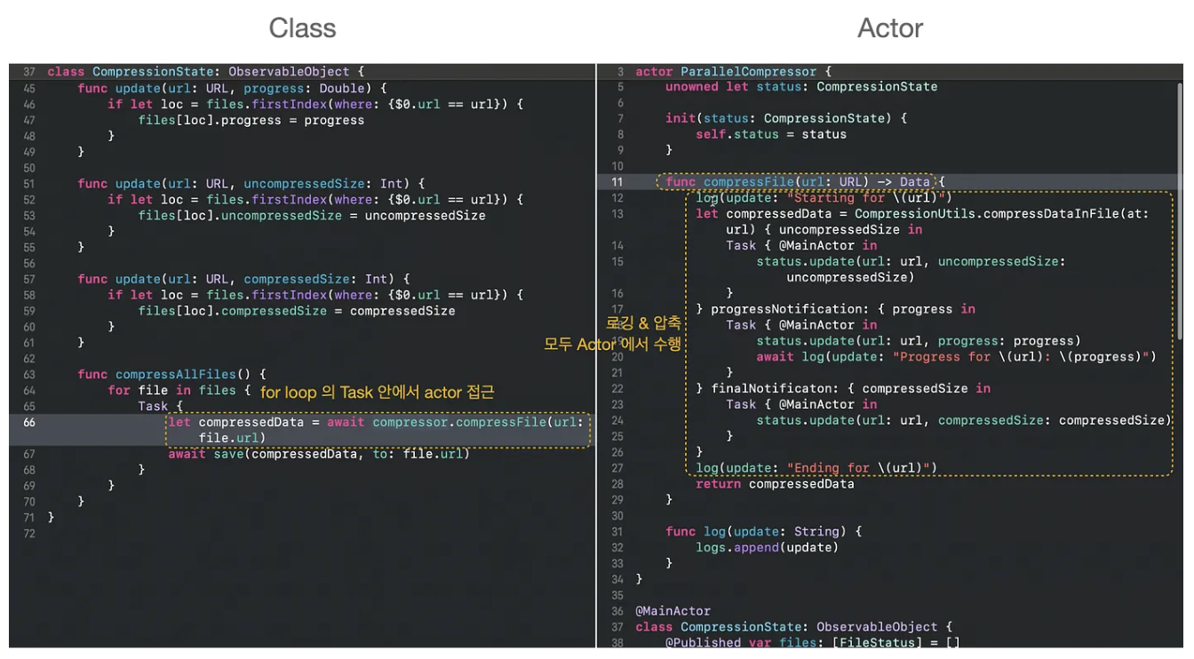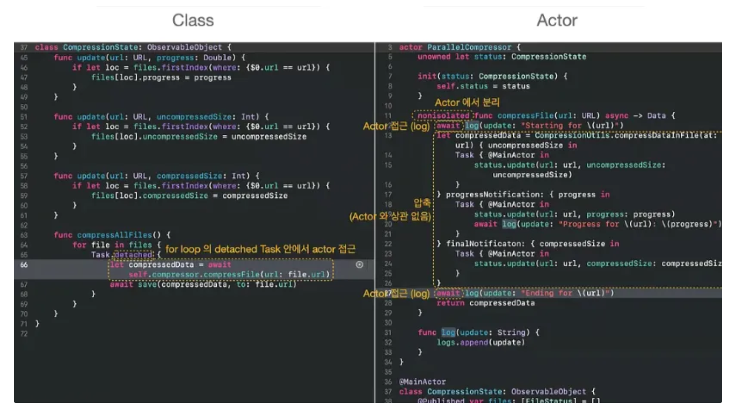 즉 아래와 같이 logs 프로퍼티와 compressionFile(url:) 메소드가 액터에 격리(isolated)되어 있다.