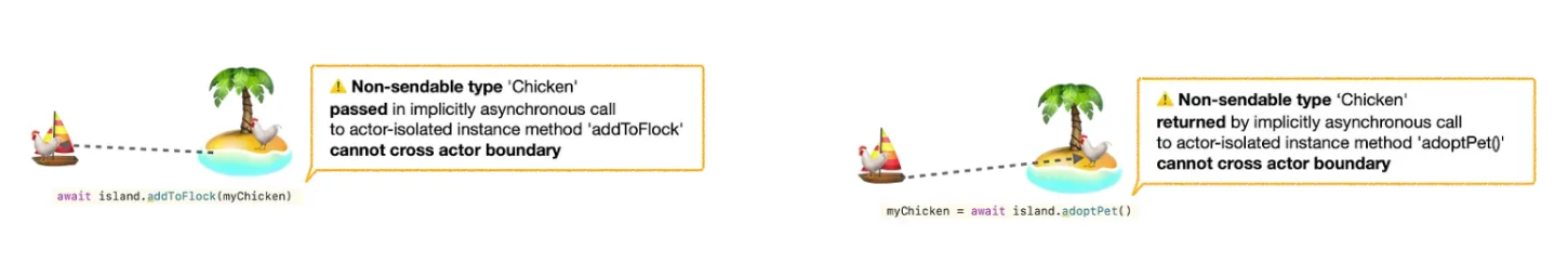 즉, 격리된 섬(actor)를 떠나 바다 위에서 실행되는 상황이므로 Sendable한 데이터만 갖고 있는지를 컴파일러가 검사한다.
