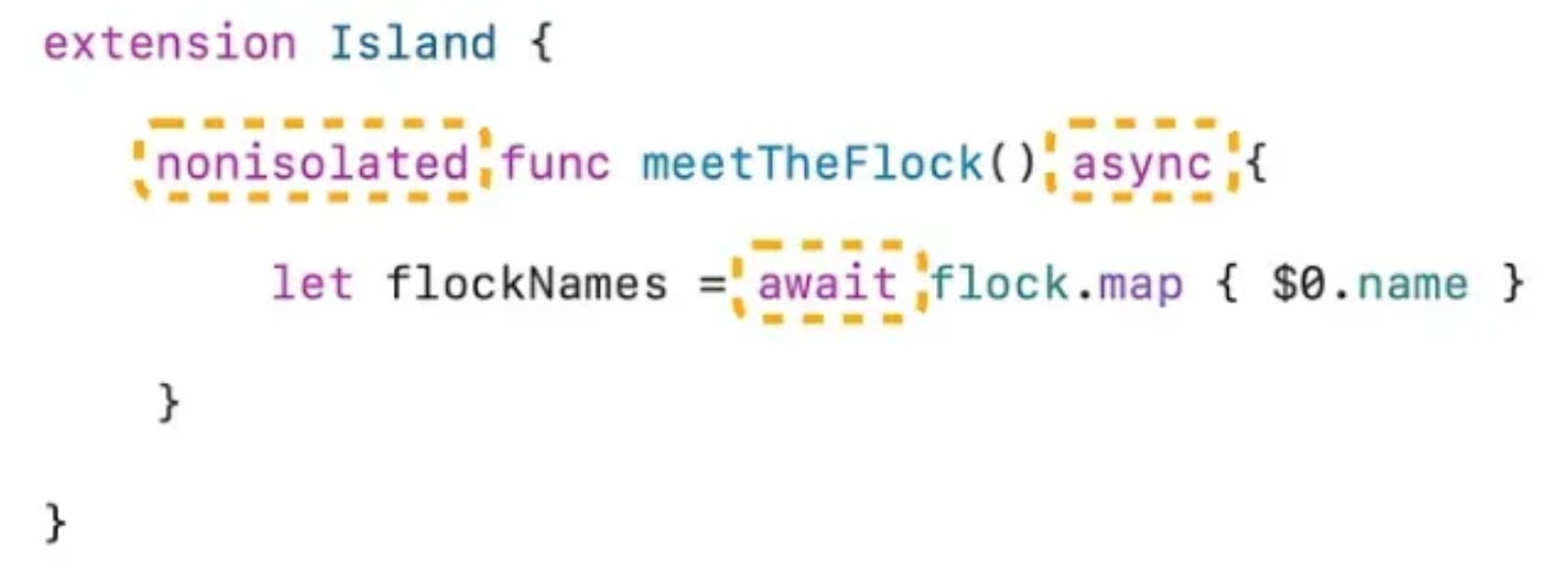 이 경우도 마찬가지로 actor의 격리된 상태 flock를 읽고 싶으면 await를 사용해야 한다.