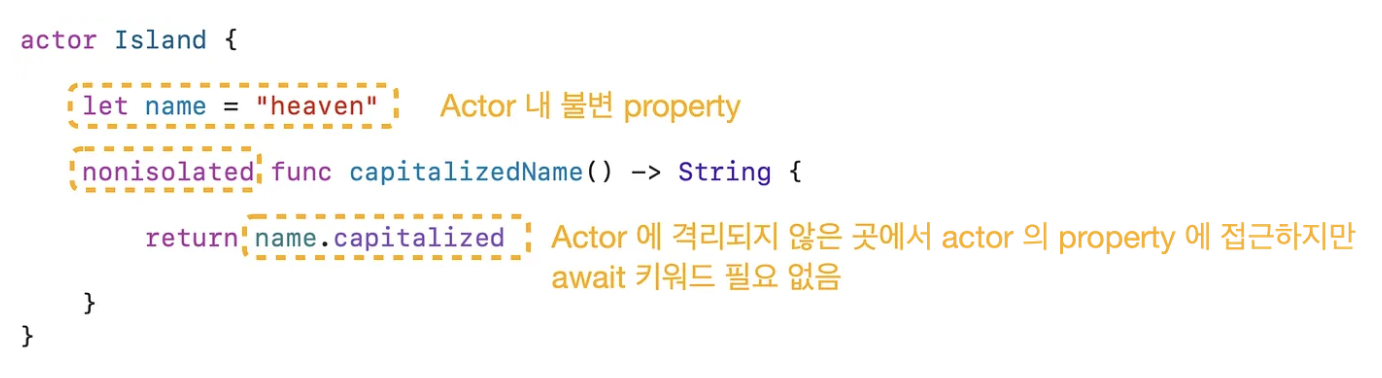 detached Task와 비슷하게, actor 내부에 있는 함수를 명시적으로 비격리로 만들기 위해 nonisolated 키워드를 사용할 수 있긴 하다.