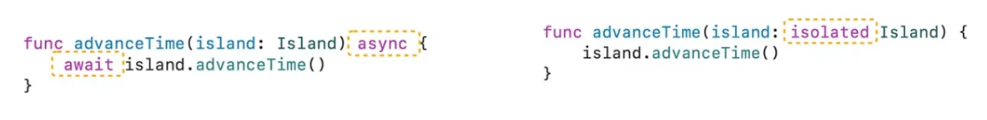 기존에 위 코드와 같이 actor의 프로퍼티나 메소드 접근을 위해 await를 붙여 사용했는데, isolated 키워드를 통해 본 메소드를 해당 Actor의 도메인으로 격리한다.는 의미로 사용할 수 있다.