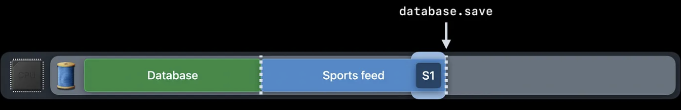 database actor가 await를 만나 Suspend 되었으니 스레드는 다른 sports feed actor를 작업시킨다.
