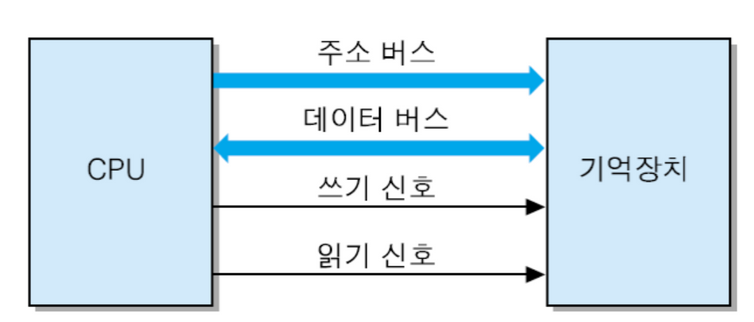 주소 및 데이터 버스 + 제어 신호(기억장치 읽기 or 쓰기 신호)