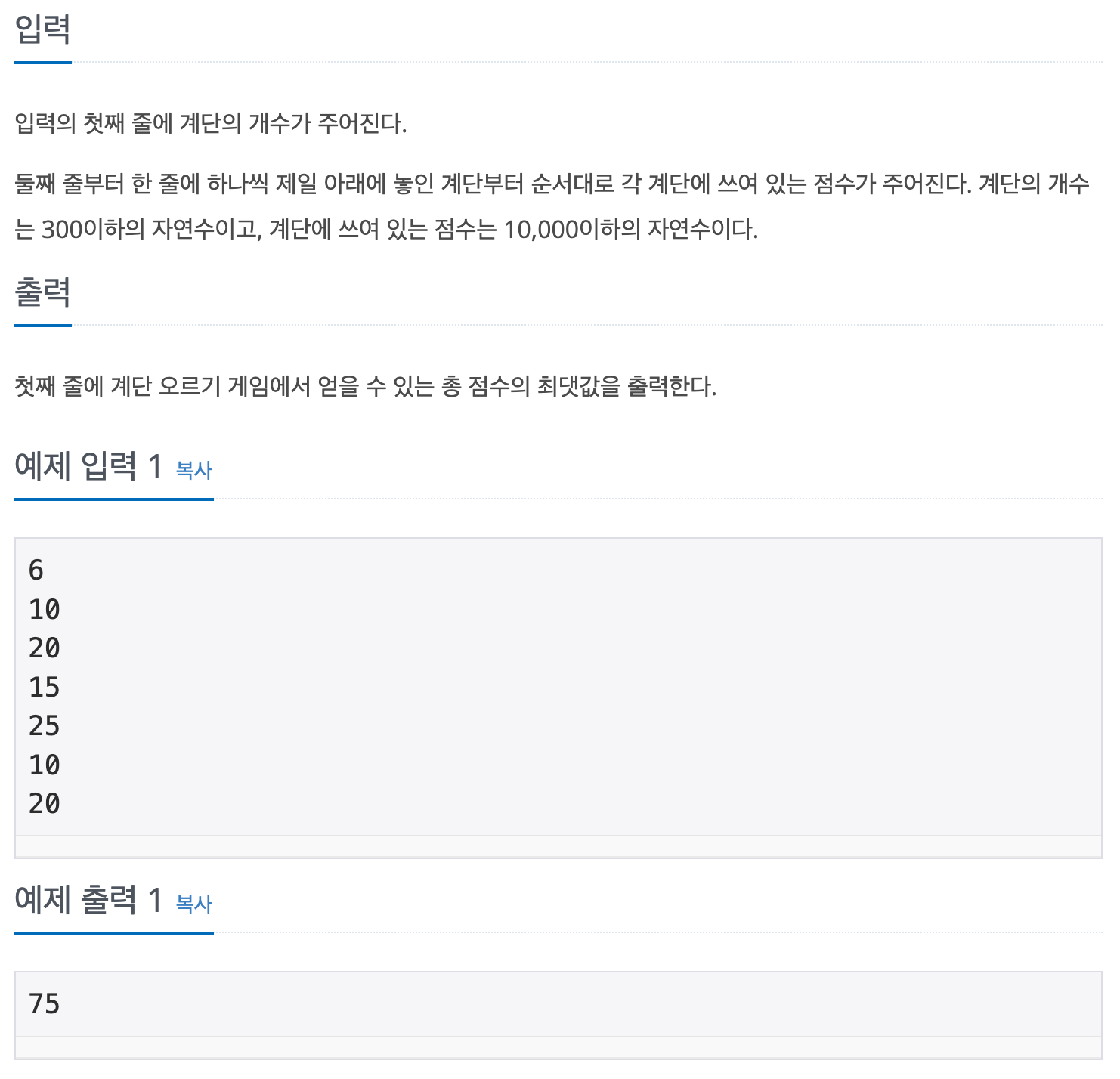 백준의 실버3 난이도 DP 알고리즘을 쓰는 '2579번 : 계단 오르기' 문제이다.